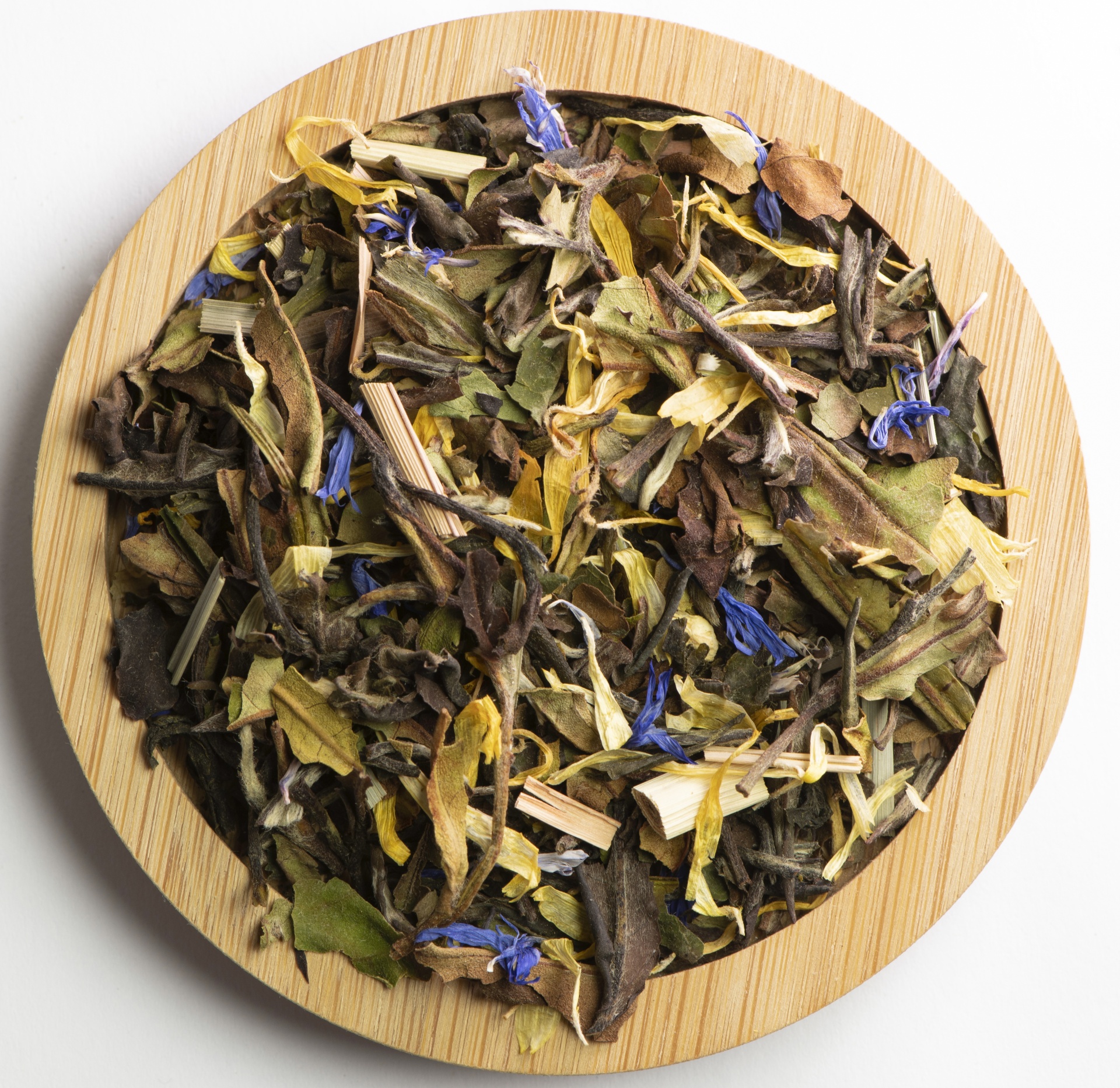 Ingredientes Chá verde, chá branco, pedaços de gengibre, erva-príncipe, pétalas de calêndula, casca de limão, pétalas de centáurea-azul