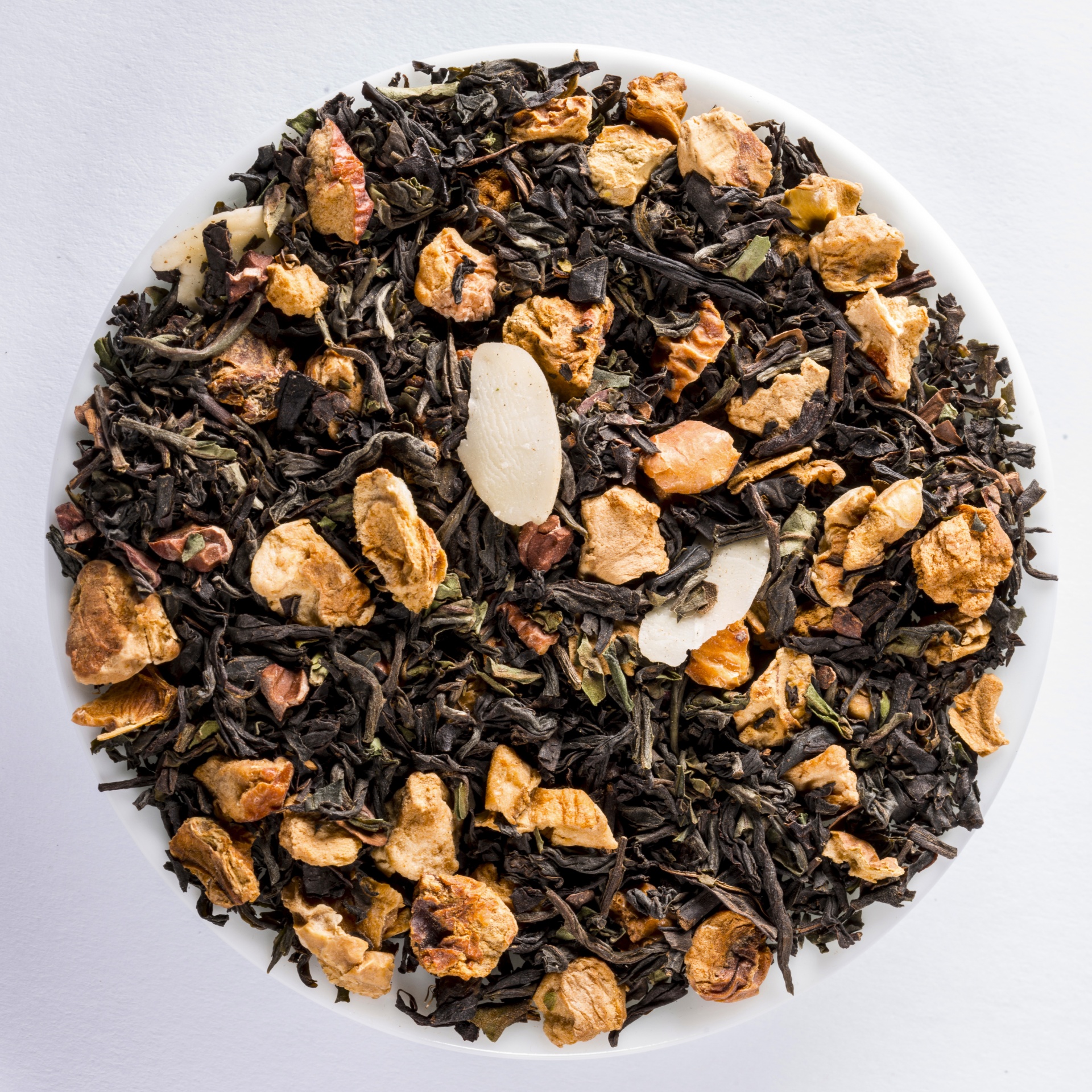 Mistura de chá preto e chá verde com pedaços de frutas secas e amêndoas